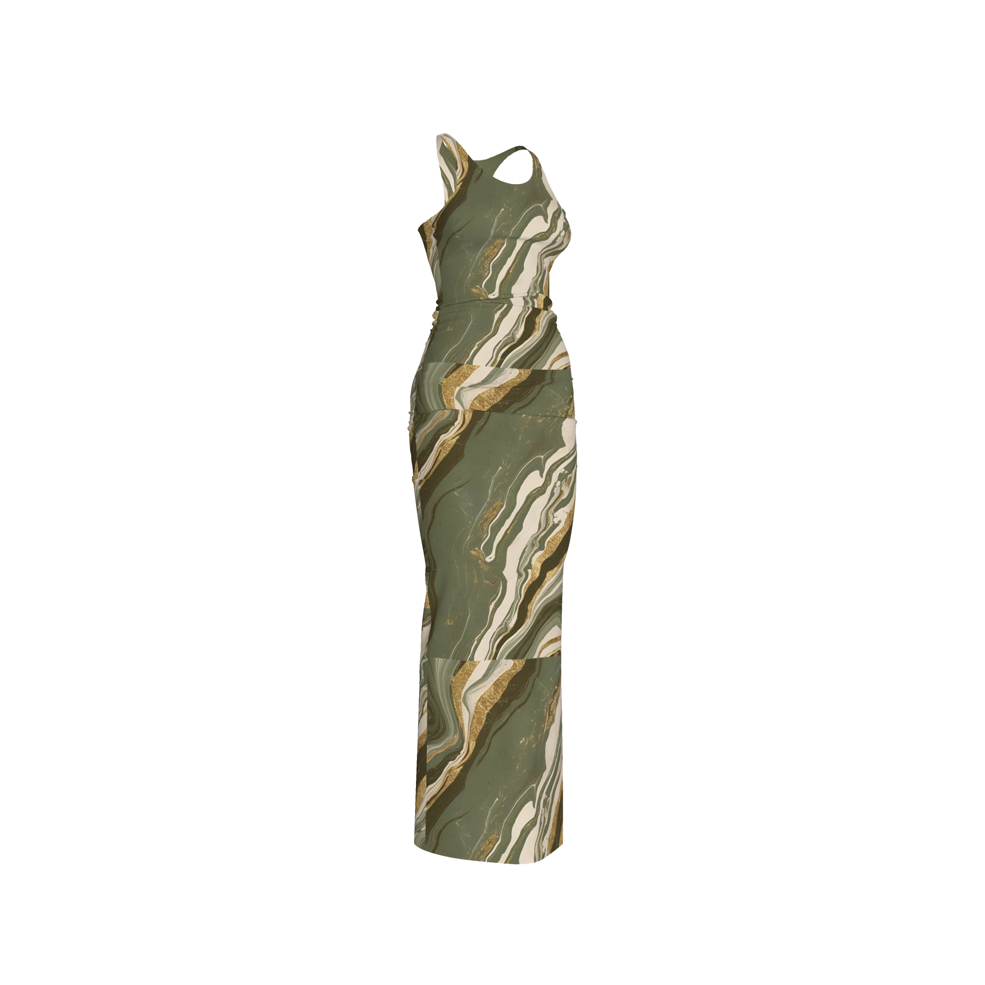 Elevated simplicity meets artistic edge in The Cascade Column Dress. With its fluid marble print in rich olive, cream, and gold tones, this piece captures the essence of natural movement and grounded elegance. Designed for the woman who commands attention without saying a word, the dress is cut from a soft, breathable rayon-spandex blend that offers both comfort and sleek structure.
