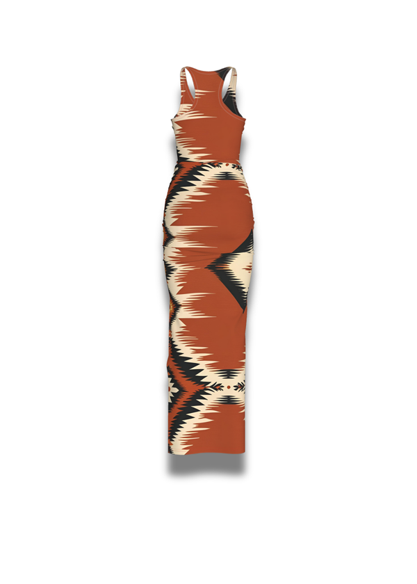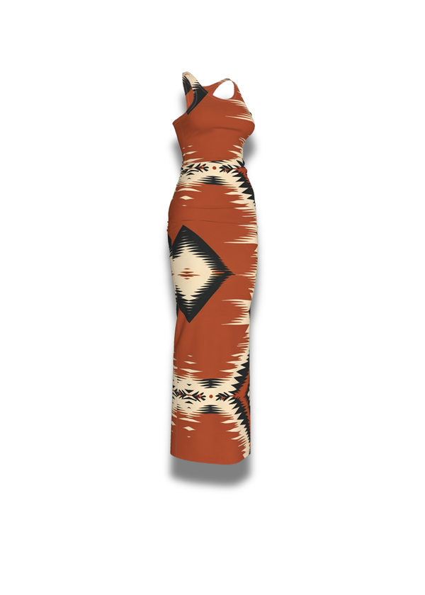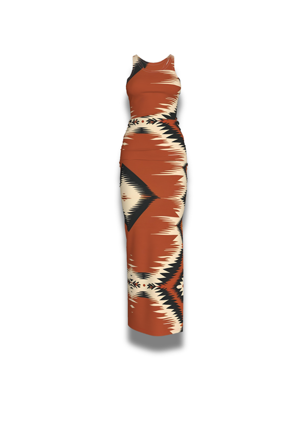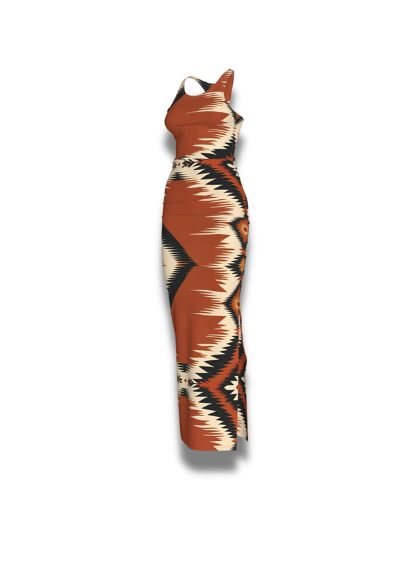 Own your presence in the Kai Split Bodycon, a statement silhouette that combines sensual minimalism with sculptural elegance. This maxi-length dress is defined by its dramatic color-blocked panels in deep black, warm bronze, and soft sand—an intentional composition that contours and enhances the natural curves of the body. A bold side slit adds dynamic energy and effortless movement to this polished, body-hugging form.