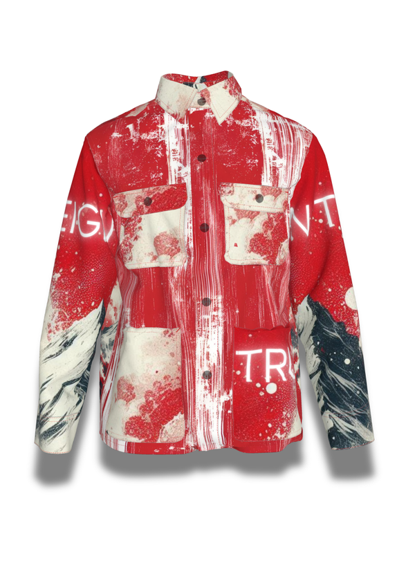 What sets this piece apart is its bold, custom print: a striking fusion of sun, sea, and mountain motifs wrapped in a palette of burnt red, faded black, warm cream, and sandy tan. The imagery evokes themes of migration, resilience, and boundary-crossing — turning a classic utilitarian garment into a canvas of layered meaning. The phrase “Foreign Trust” is printed across the back in bold lettering, inviting both interpretation and conversation.