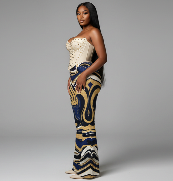 The Aurora Jeans bring celestial energy to earth with their swirling fusion of midnight blue, ivory, and auric gold. Crafted from a premium cotton-Tencel stretch twill, these jeans hug the body in all the right places with a soft yet structured feel. The high-rise waist and flared leg elongate the silhouette, while the subtle stretch ensures all-day comfort without compromising the fit.